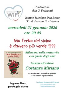 L’appuntamento, dal titolo “Ma l’erba del vicino è davvero più verde?”, nasce dalla collaborazione con il Monastero WiFi di Verona. Sarà un’occasione preziosa per riflettere, anche attraverso l’ironia e la profondità tipiche dell’autrice, sulla bellezza di abitare la propria storia personale senza lasciarsi condizionare dai confronti e dalle inquietudini del mondo contemporaneo. Un invito a ritrovare il centro di sé stessi per guardare alla vita con gratitudine e speranza.