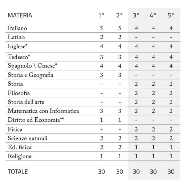 L’offerta formativa include lo studio dell’inglese e del tedesco come prima e seconda lingua straniera. Gli studenti hanno inoltre la possibilità di scegliere una terza lingua straniera tra spagnolo e cinese. Lo studio delle lingue straniere è arricchito dalla conversazione con i docenti madrelingua al fine di arricchire l’apprendimento linguistico.
